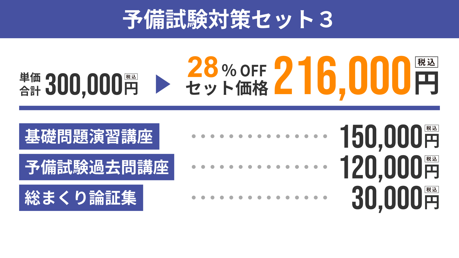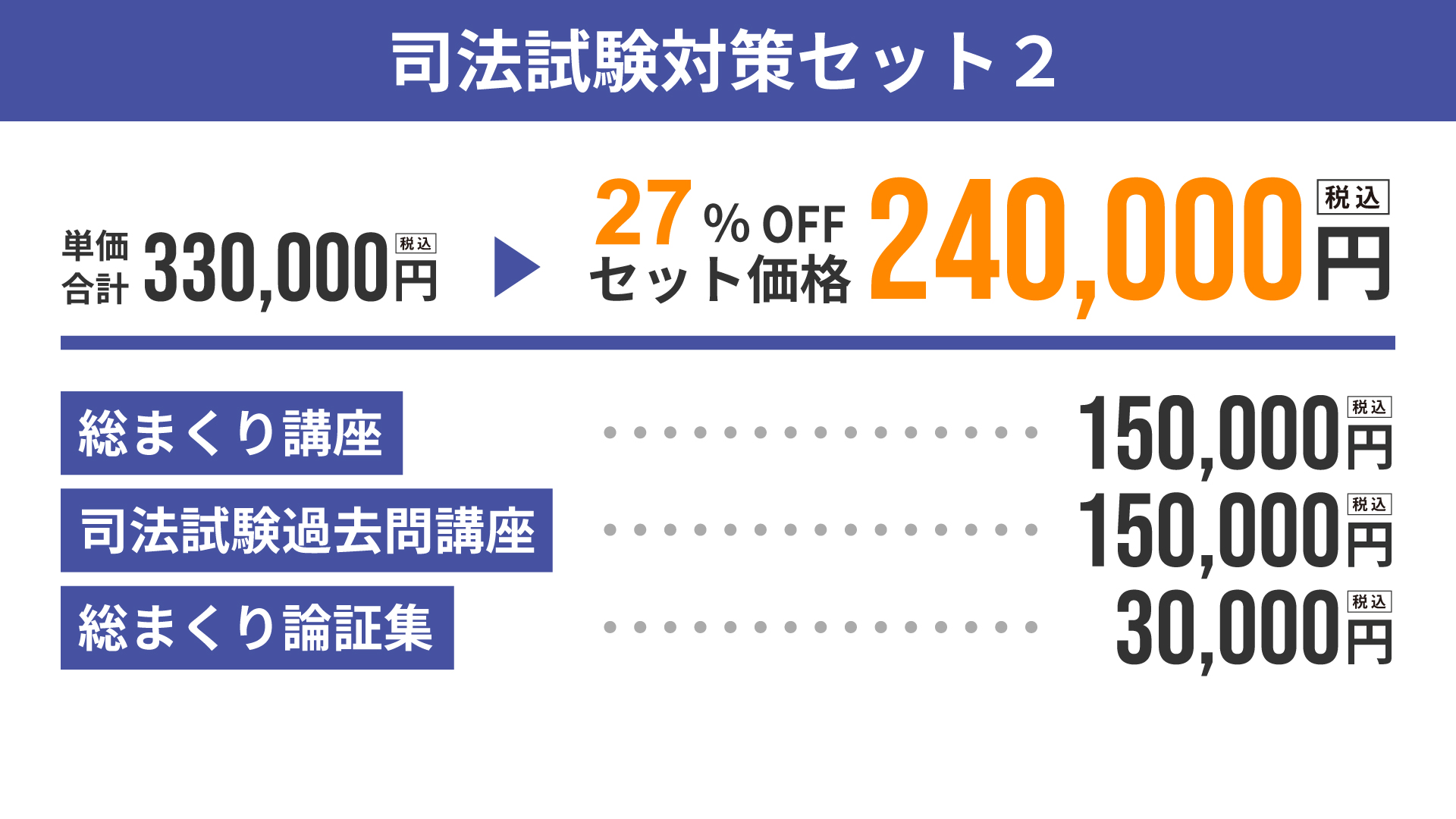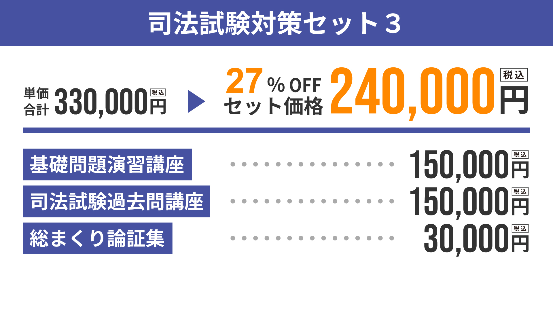 例えば、基本7科目の総まくり講座2025(定価150,000円)を購入した後に基本7科目の基礎問題演習講座2025(定価150,000円)を追加購入する場合には、両講座のセットプランである司法試験対策セット1の販売価格(定価240,000円)との差額分である90,000円をご負担いただくことになります。その際、セットプランの特典として、総まくり論証集2025(定価30,000円)が無料で付属します。