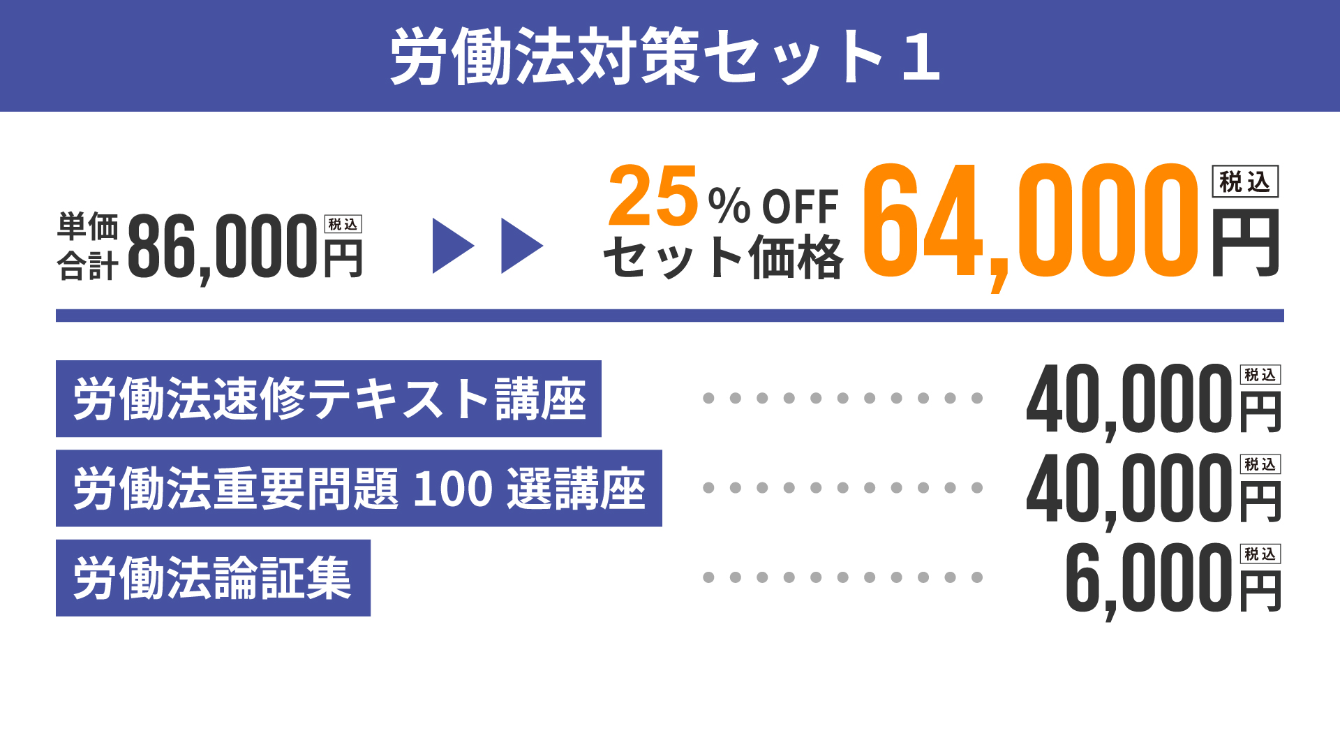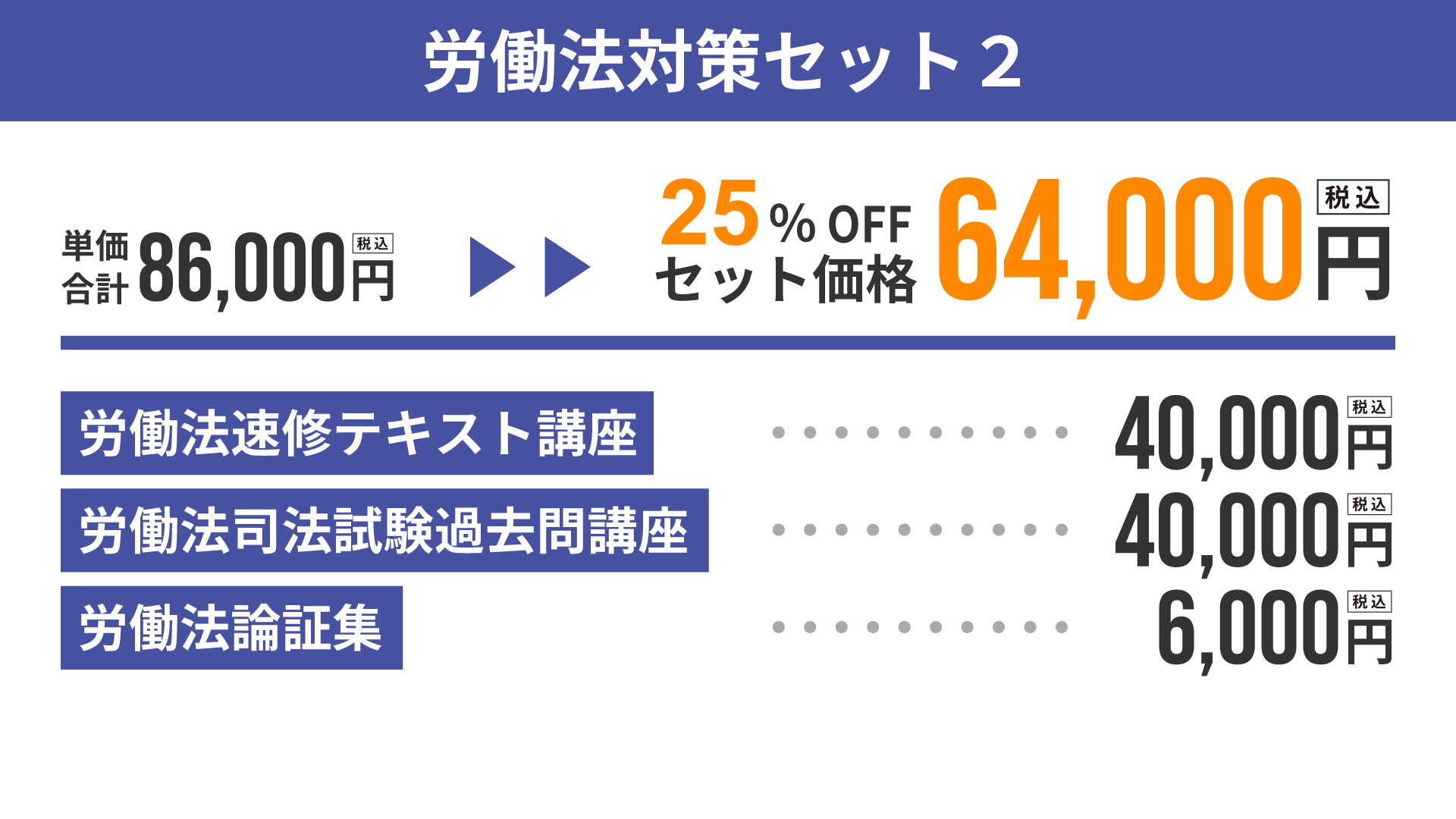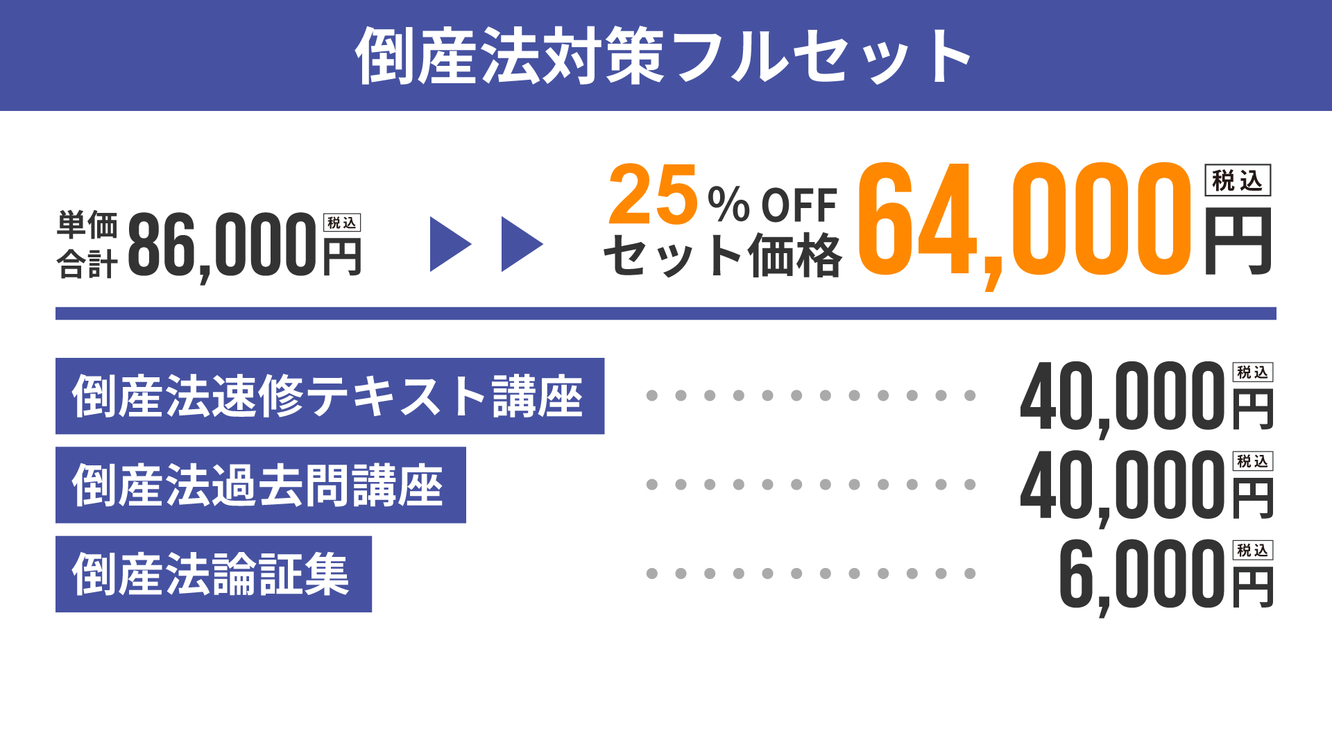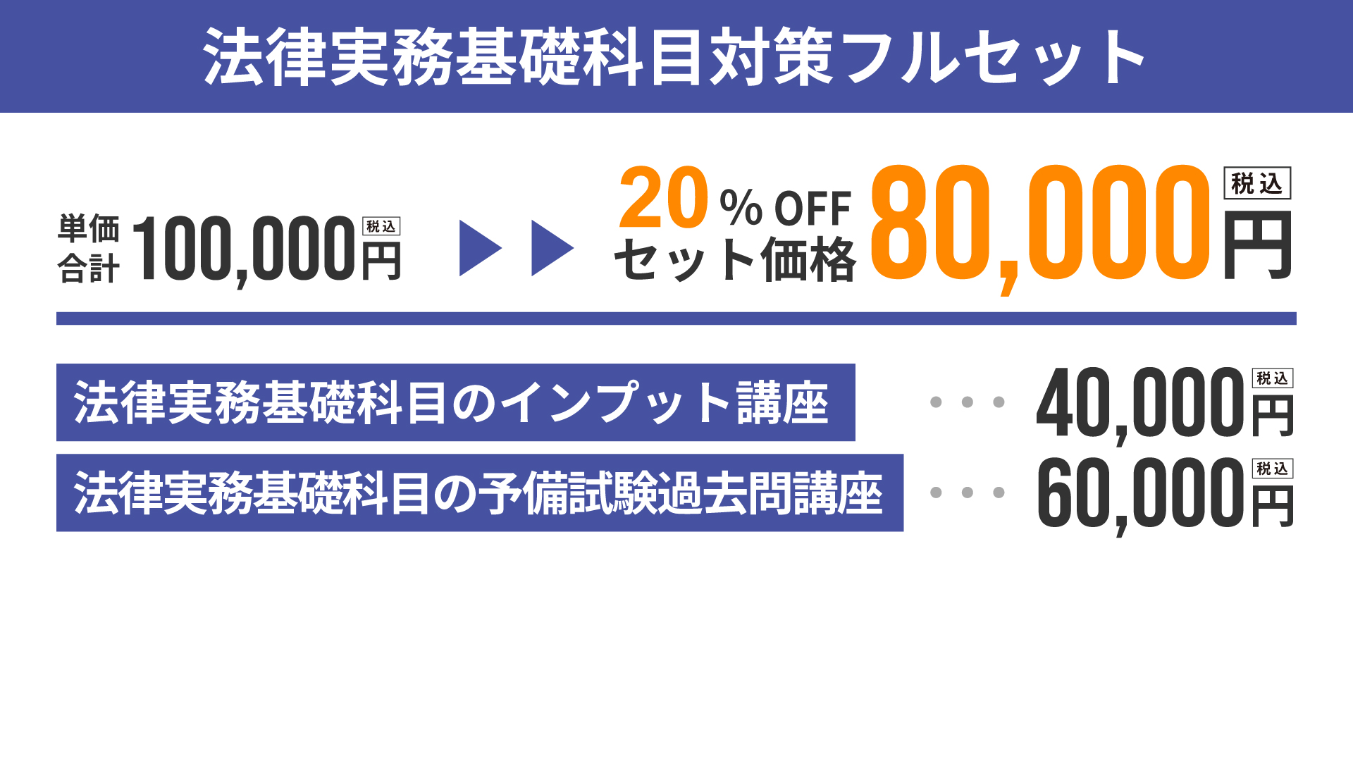 例えば、基本7科目の総まくり講座2025(定価150,000円)を購入した後に基本7科目の基礎問題演習講座2025(定価150,000円)を追加購入する場合には、両講座のセットプランである司法試験対策セット1の販売価格(定価240,000円)との差額分である90,000円をご負担いただくことになります。その際、セットプランの特典として、総まくり論証集2025(定価30,000円)が無料で付属します。
