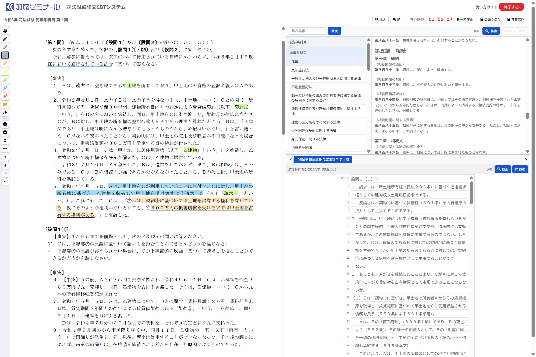 受講者様は、本システムにおいて、好きな問題を選んで、法務省で公開されている論文式のCBTシステムの体験版に類似する環境下で、論文演習を行うことができます。