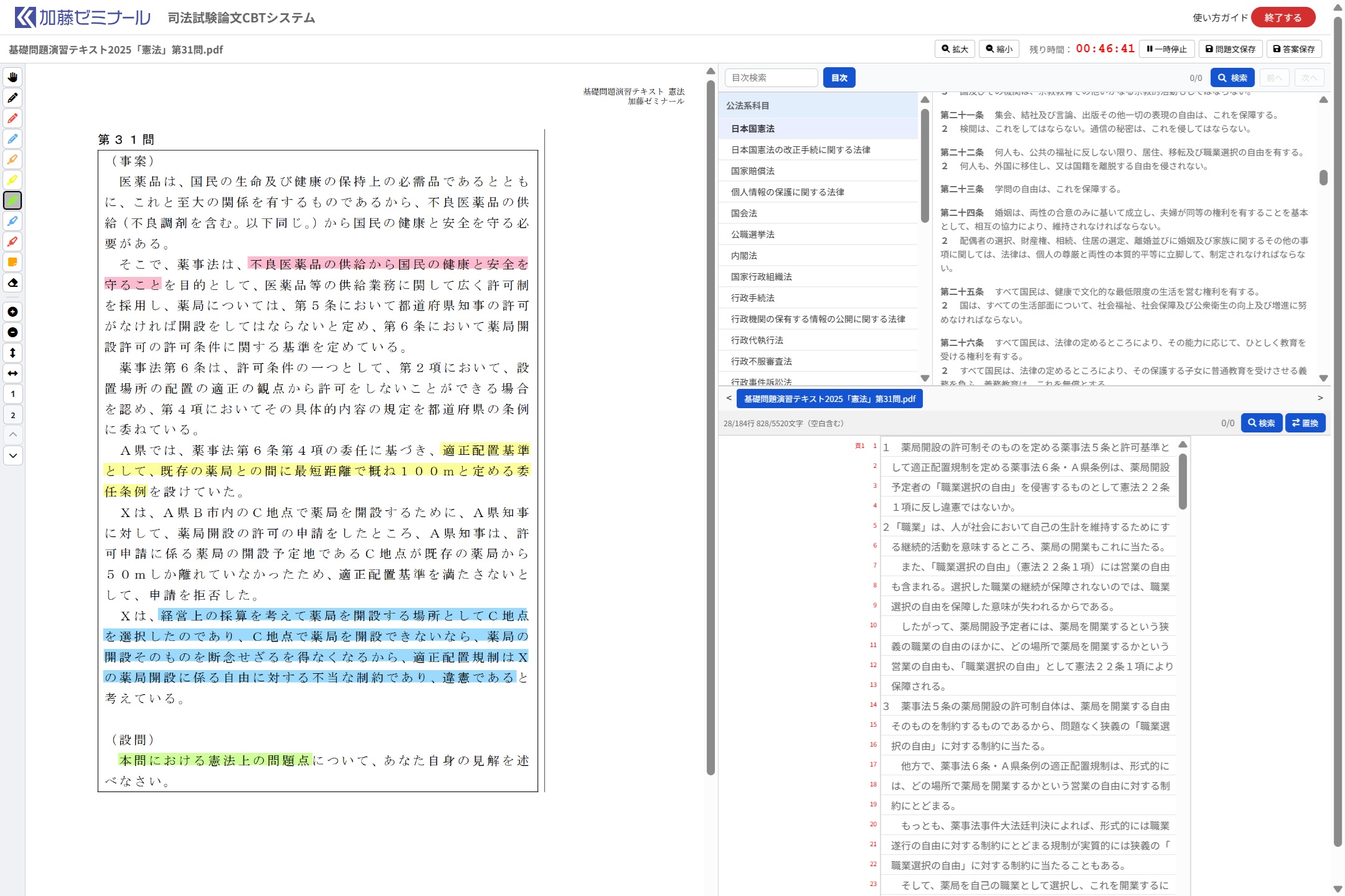 複数の問題文を選択して一気に解くこともでき、問題文の組合せに制限はございません。例えば、司法試験の選択科目や予備試験の基本7科目・実務基礎科目において、年度の異なる問題を複数選択することも可能です。
