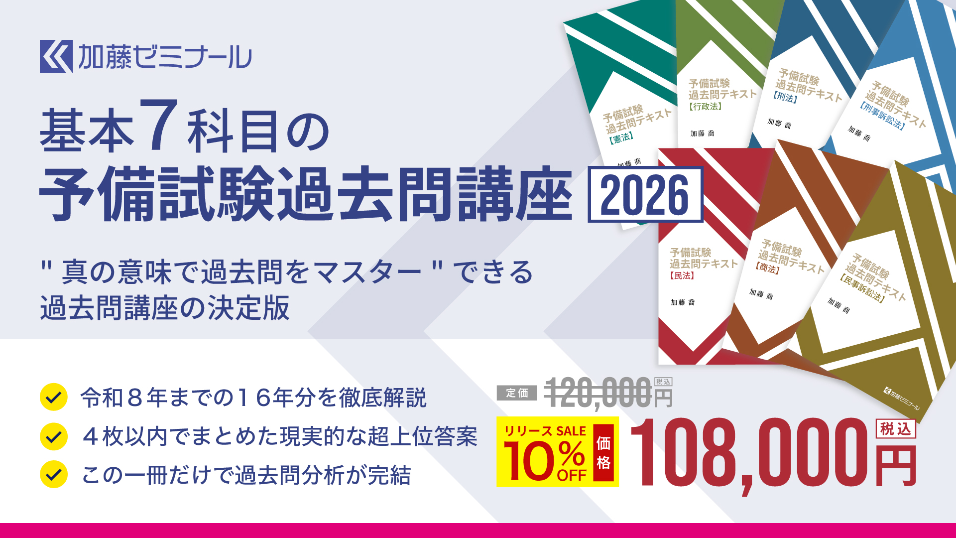全年度(サンプル問題、平成23年~令和8年)を取り上げる予備試験過去問講座の決定版!