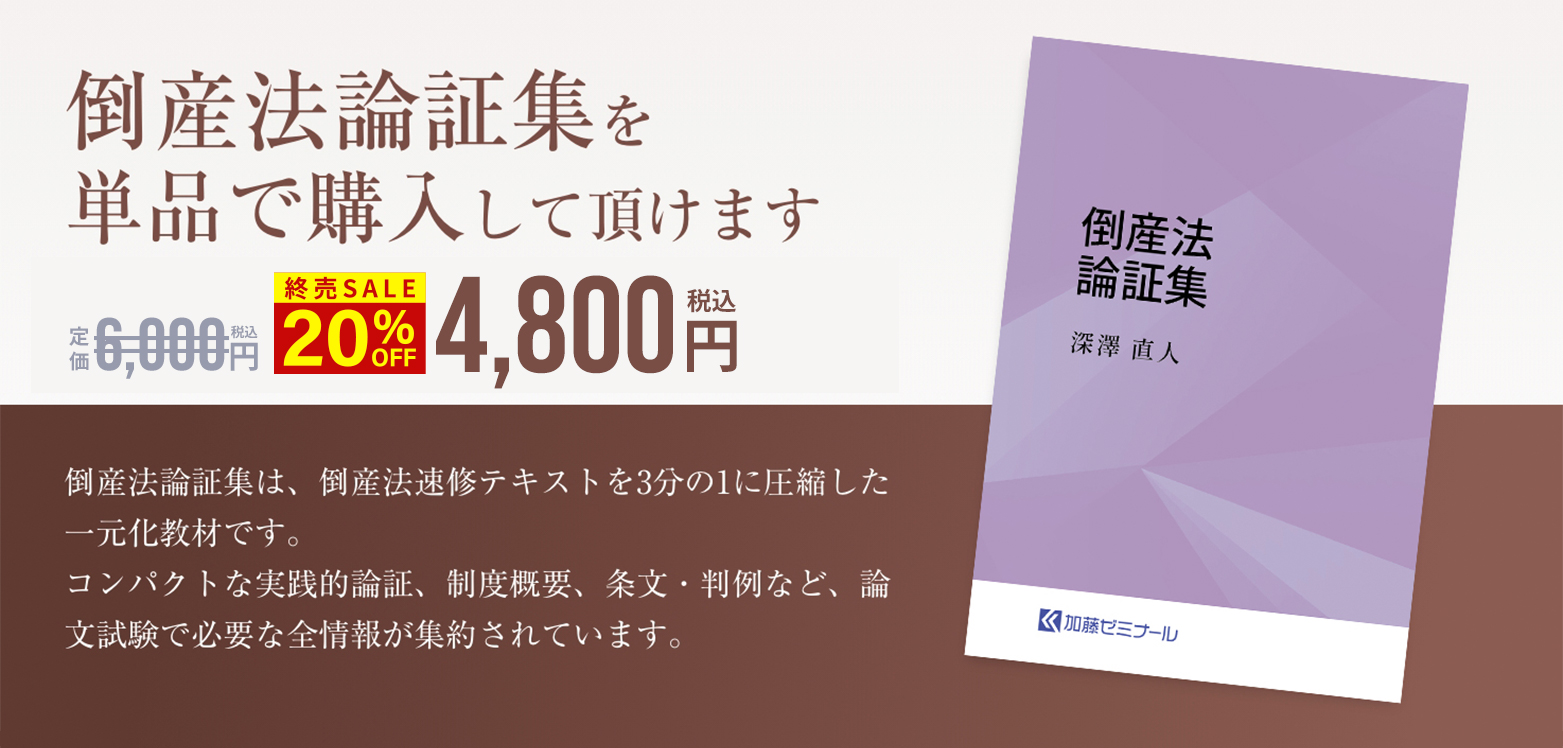 倒産法論証集は、倒産法速修テキストを3分の1程度に凝縮した一元化教材です。試験直前期に効率的な総復習をする上でも非常に役立ちます。