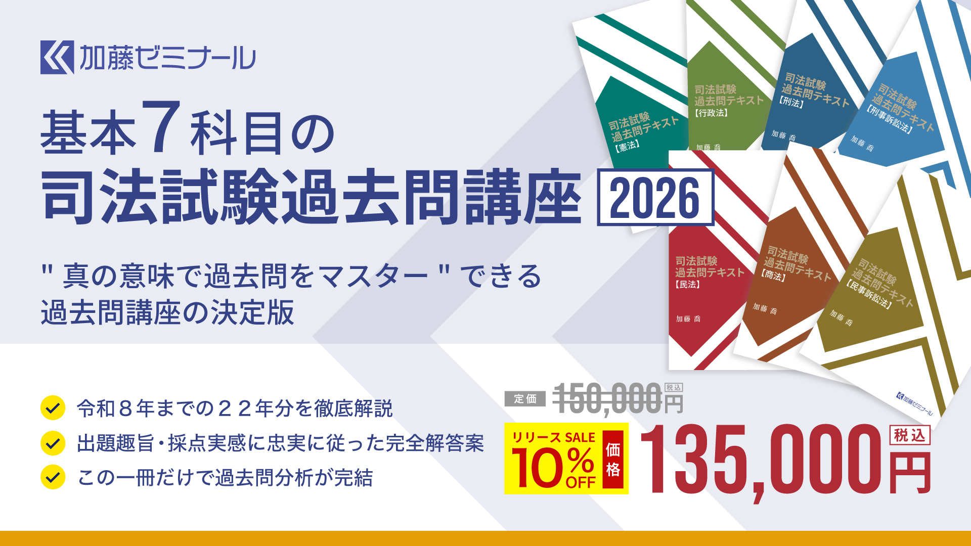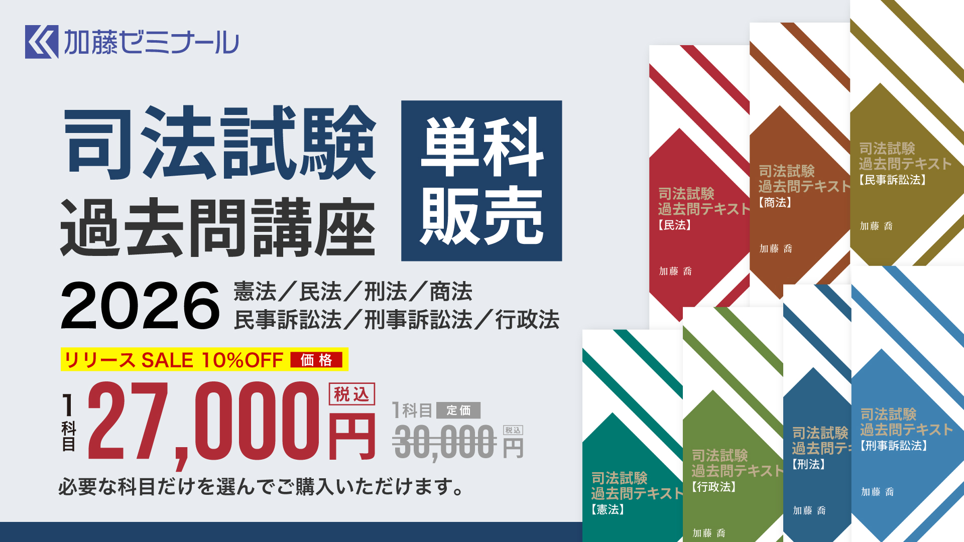 加藤ゼミナールの基本7科目の試験対策講座は、①総まくり講座(中上級者向けのインプット講座)、②基礎問題演習講座(短文事例問題演習の講座)、③予備試験過去問講座、④司法試験過去問講座の4つです。
