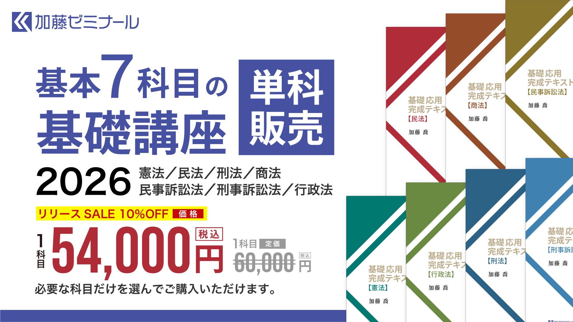 | 刑事訴訟法 | 販売価格: . 教材:以下の教材を一括配送します ・導入テキスト1冊(160頁) ・基礎応用完成テキスト「刑事訴訟法」1冊(457頁) ・総まくり論証集「刑事訴訟法」1冊(229頁) ・講義スライド「刑事訴訟法」(PDF&印刷紙) .... 講義時間:約28時間 . 教材配送:2026年3月中に発送開始 . 動画配信:全動画配信完了 . 視聴期限:2028年9月末まで . →刑事訴訟法の単科購入ページに進む |
