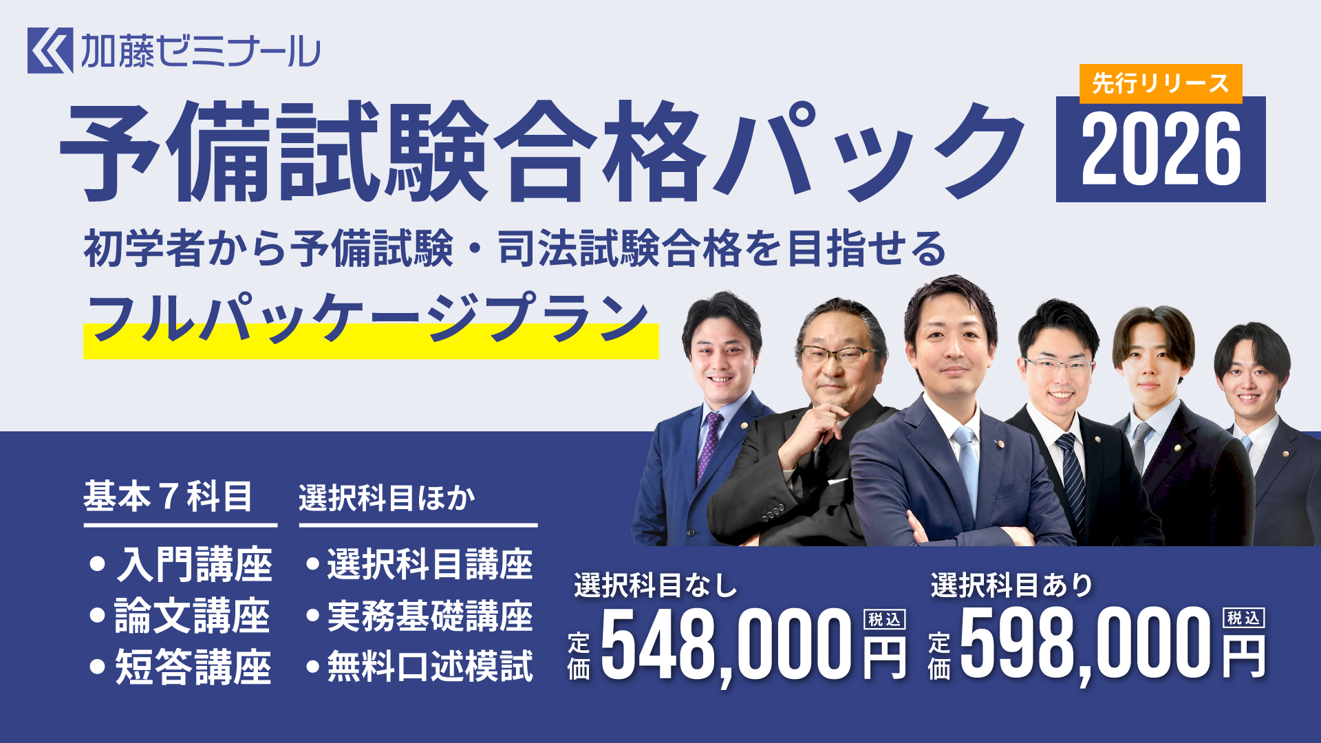 | 担当講師 | 加藤 喬(基本7科目+労働法) 高野 泰衡(基本7科目) 加藤 駿征(経済法) 深澤 直人(倒産法) 寺井昂輝(知的財産法) |