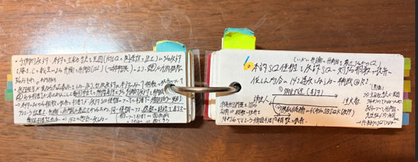 各過去問の講座を受講後は、直ちに20分程度で大きめのカード帳にその年の論点分野や気づき、論証集に書きこむべき内容や答案を書くうえで注意すべきこと等をまとめるようにしていました。