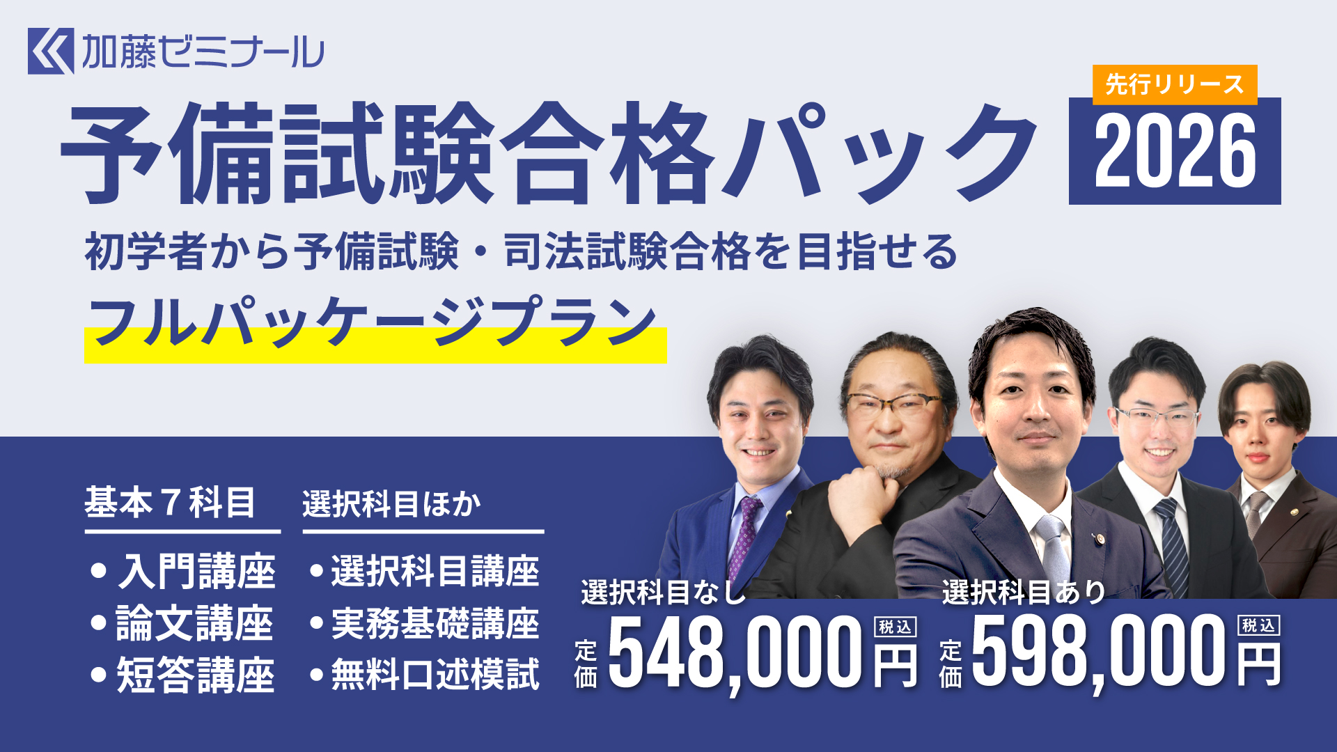 加藤ゼミナールの予備試験合格パックを受講したことのある方は、最新版の予備試験合格パックを50%引きでご受講いただけます。